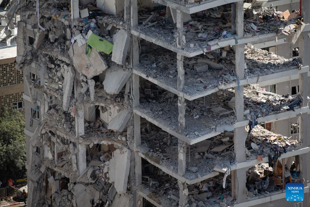 This photo taken on June 15, 2025 shows buildings damaged by a missile fired from Iran in Bat Yam, central Israel. According to Israel's state-owned Kan TV News, the death toll from Iran's strikes since Friday has reached 14. (Xinhua/Chen Junqing)