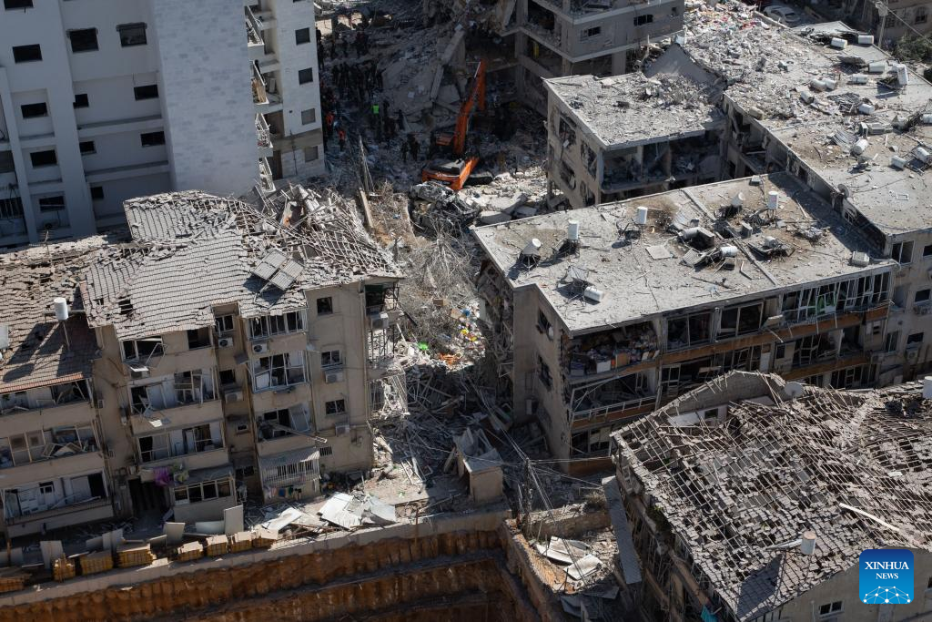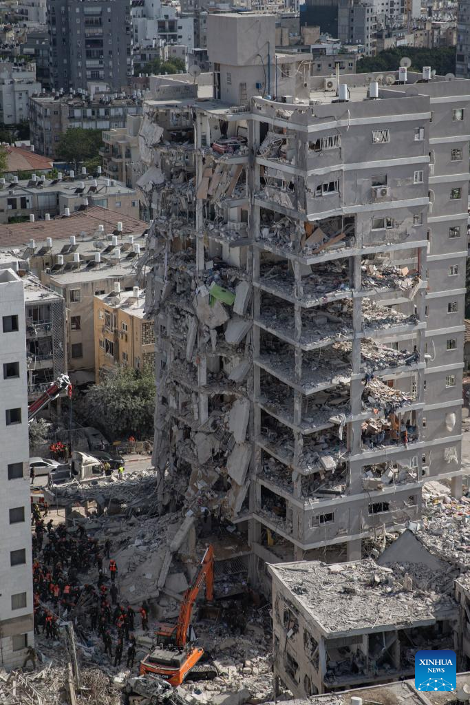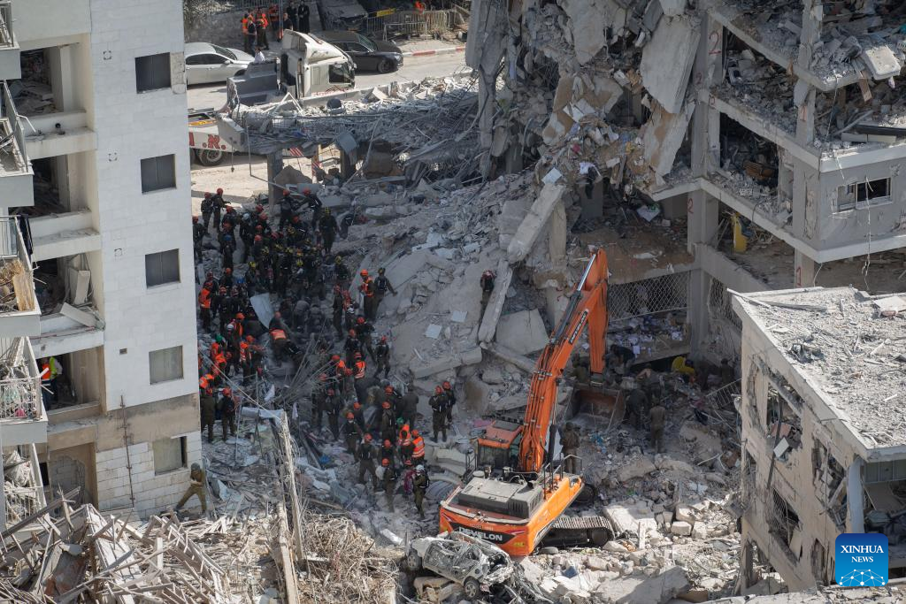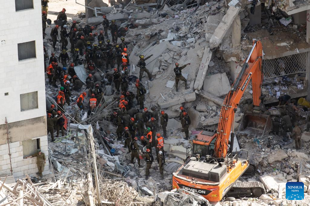 Israeli security and rescue forces work at the scene where buildings were damaged by a missile fired from Iran in Bat Yam, central Israel, on June 15, 2025. According to Israel's state-owned Kan TV News, the death toll from Iran's strikes since Friday has reached 14. (Xinhua/Chen Junqing)