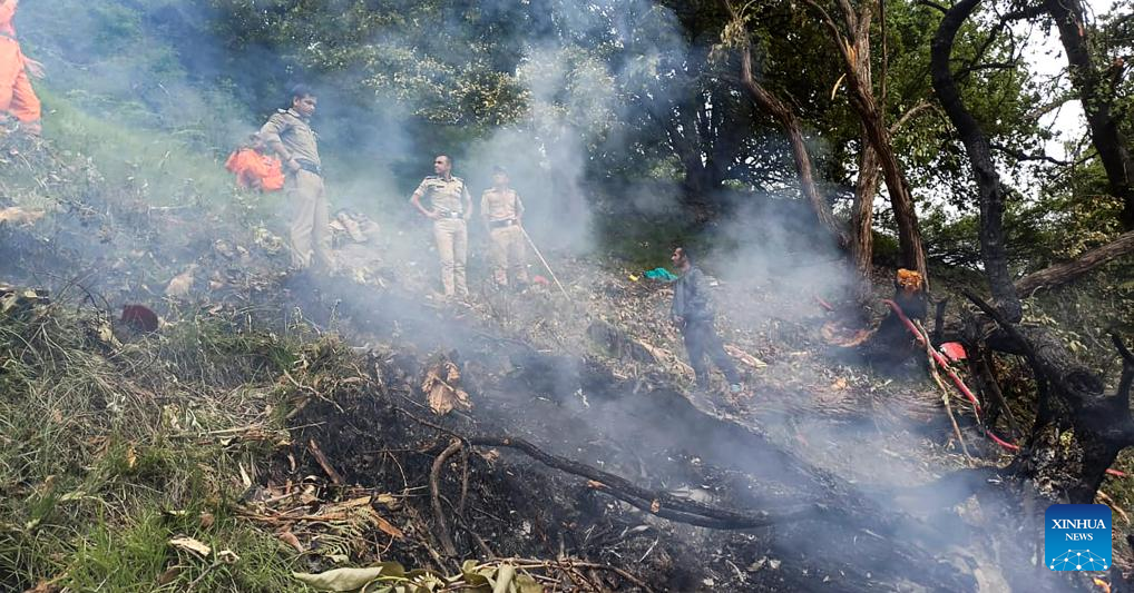 This photo shows the site of a private chopper crash in India's northern hilly state of Uttarakhand on June 15, 2025. Seven people, including two children, the pilot and four male passengers, were dead in the private chopper crash in India's northern hilly state of Uttarakhand early on Sunday, a senior state government official said. (IANS/Handout via Xinhua)