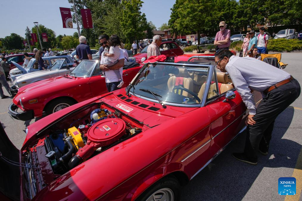 People view a classic car during the "Classica Auto Italiana" event in Vancouver, British Columbia, Canada, June 15, 2025. Featuring over a hundred Italian classic and supercars, the one-day event was held in Vancouver on Sunday. (Photo by Liang Sen/Xinhua)