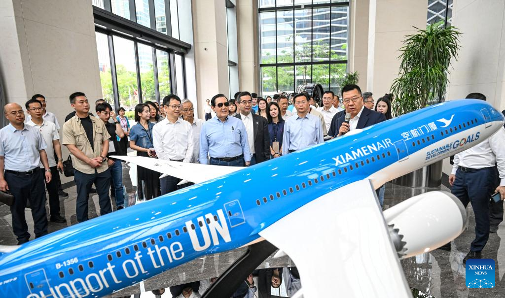 Ma Ying-jeou, former chairman of the Chinese Kuomintang party, and members of a delegation of Taiwan youth visit the headquarters of the Xiamen Airlines in southeast China's Fujian Province, June 16, 2025. (Xinhua/Chen Yehua)