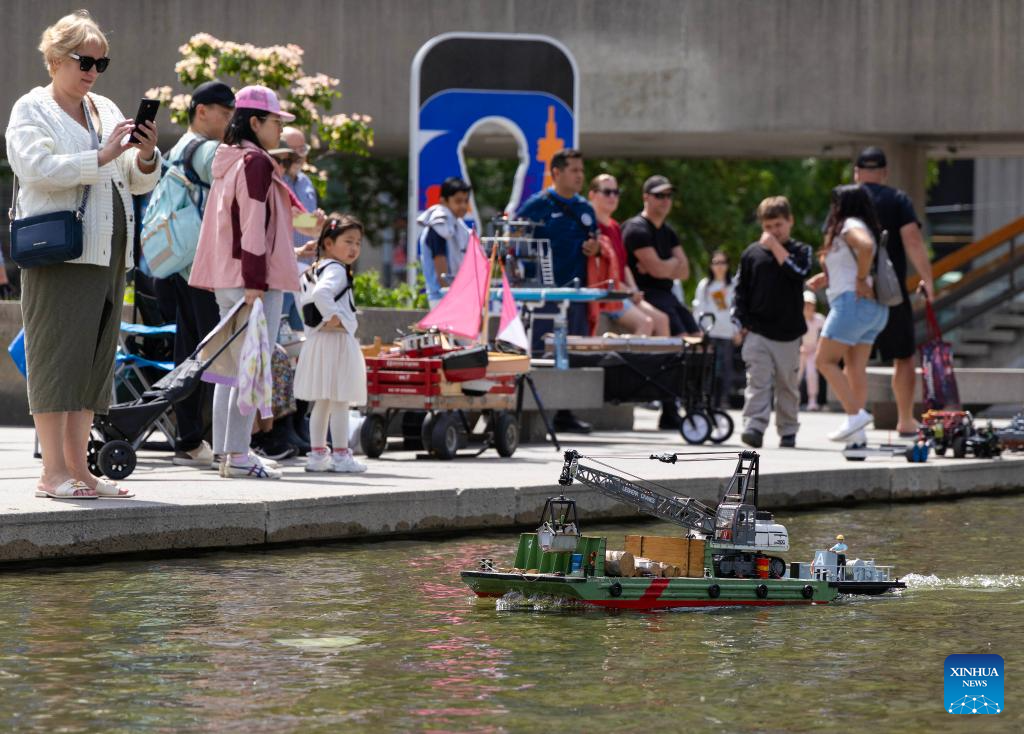 People watch a model boating race known as the Boating Regatta in the Pond in Toronto, Canada, on June 15, 2025. The event was held here on Sunday, attracting dozens of marine modellers with their different classes of boat models. (Photo by Zou Zheng/Xinhua)