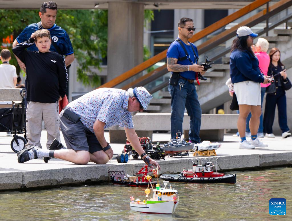 Marine modellers compete in a model boating race known as the Boating Regatta in the Pond in Toronto, Canada, on June 15, 2025. The event was held here on Sunday, attracting dozens of marine modellers with their different classes of boat models. (Photo by Zou Zheng/Xinhua)