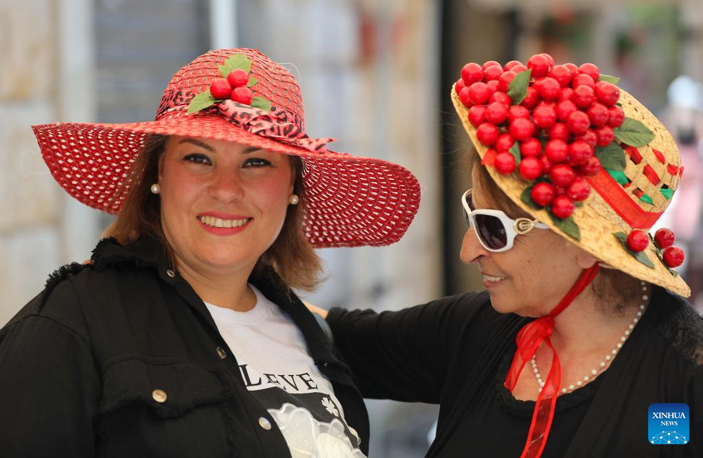 Women wear cherry-decorated hats during the Hammana Cherry Festival at the village of Hammana, Mount Lebanon, Lebanon, on June 15, 2025. The annual event features local cherry products, traditional music, and artisan displays, highlighting the agricultural and cultural richness of the region during the cherry harvest season. (Xinhua/Bilal Jawich)