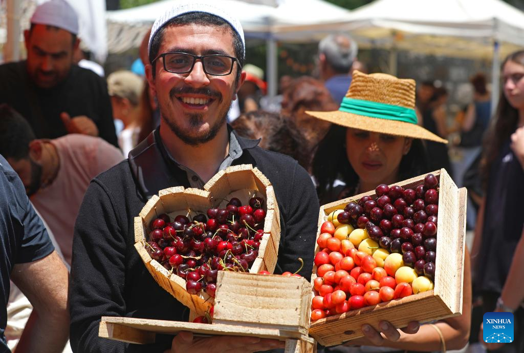 People visit a stall during the Hammana Cherry Festival at the village of Hammana, Mount Lebanon, Lebanon, on June 15, 2025. The annual event features local cherry products, traditional music, and artisan displays, highlighting the agricultural and cultural richness of the region during the cherry harvest season. (Xinhua/Bilal Jawich)