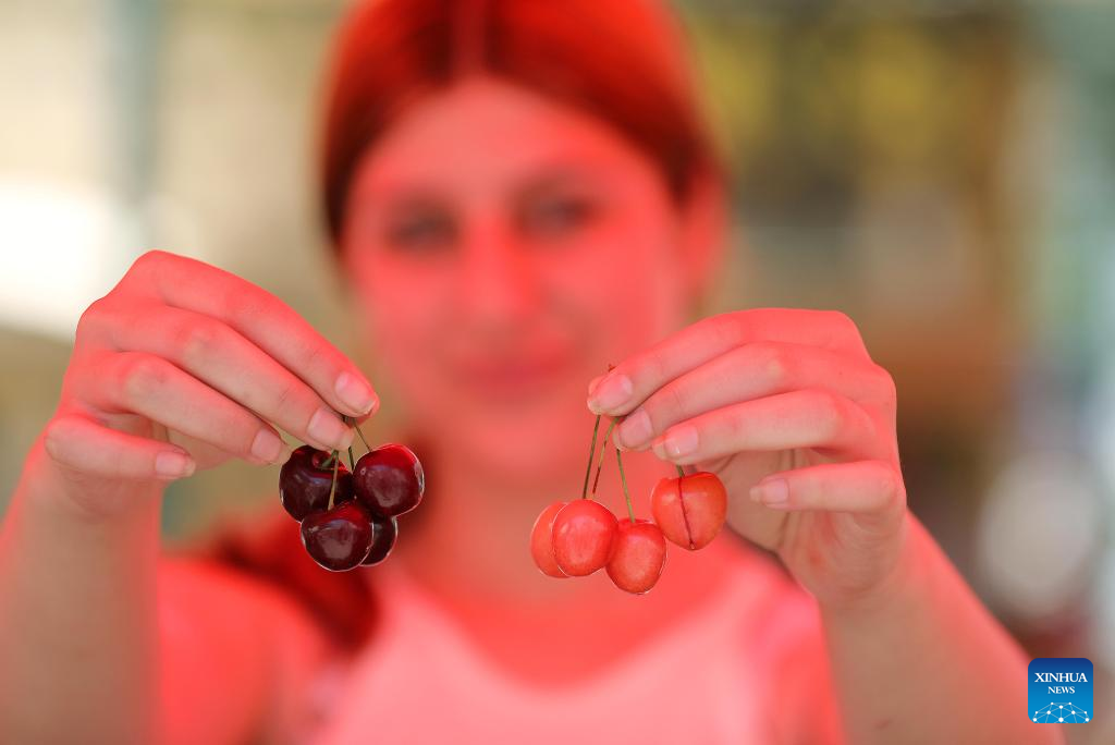 A woman takes photos of cherries during the Hammana Cherry Festival at the village of Hammana, Mount Lebanon, Lebanon, on June 15, 2025. The annual event features local cherry products, traditional music, and artisan displays, highlighting the agricultural and cultural richness of the region during the cherry harvest season. (Xinhua/Bilal Jawich)