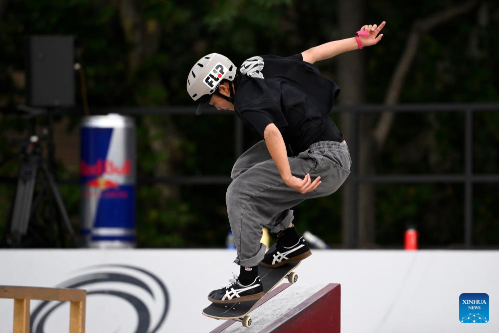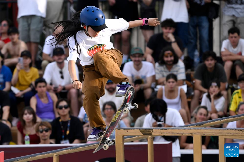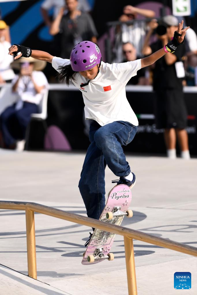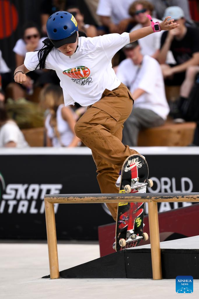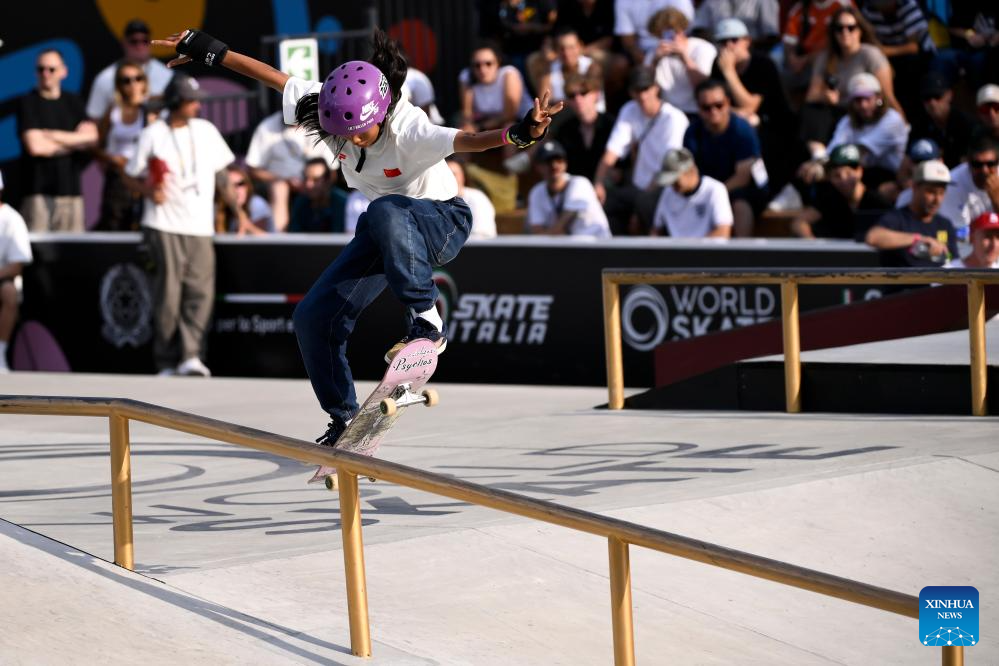 Cui Chenxi of China competes during the women's final match at the street skateboarding World Cup at the Colle Oppio Street Skatepark in Rome, Italy, June 15, 2025. (Photo by Andrea Staccioli/Xinhua)