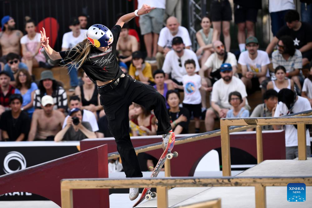 Chloe Covell of Australia competes during the women's final match at the street skateboarding World Cup at the Colle Oppio Street Skatepark in Rome, Italy, June 15, 2025. (Photo by Andrea Staccioli/Xinhua)