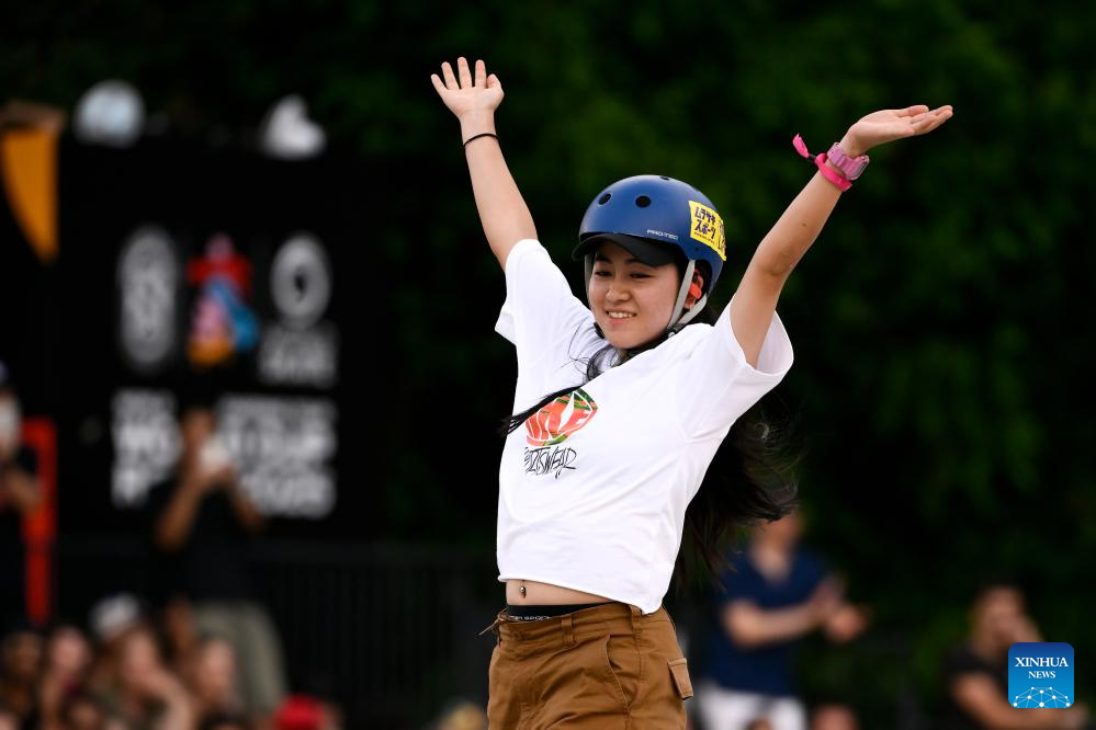Nakayama Funa of Japan celebrates during the women's final match at the street skateboarding World Cup at the Colle Oppio Street Skatepark in Rome, Italy, June 15, 2025. (Photo by Andrea Staccioli/Xinhua)