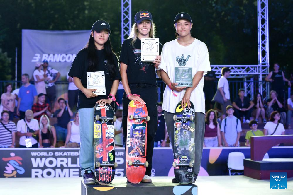 Gold medalist Chloe Covell (C) of Australia, silver medalist Nakayama Funa (L) of Japan, and bronze medalist Matsumoto Ibuki of Japan pose during the awarding ceremony of the women's final match at the street skateboarding World Cup at the Colle Oppio Street Skatepark in Rome, Italy, June 15, 2025. (Photo by Andrea Staccioli/Xinhua)
