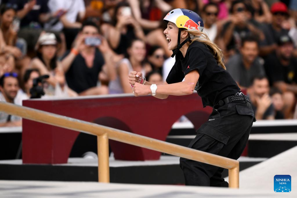 Chloe Covell of Australia celebrates during the women's final match at the street skateboarding World Cup at the Colle Oppio Street Skatepark in Rome, Italy, June 15, 2025. (Photo by Andrea Staccioli/Xinhua)