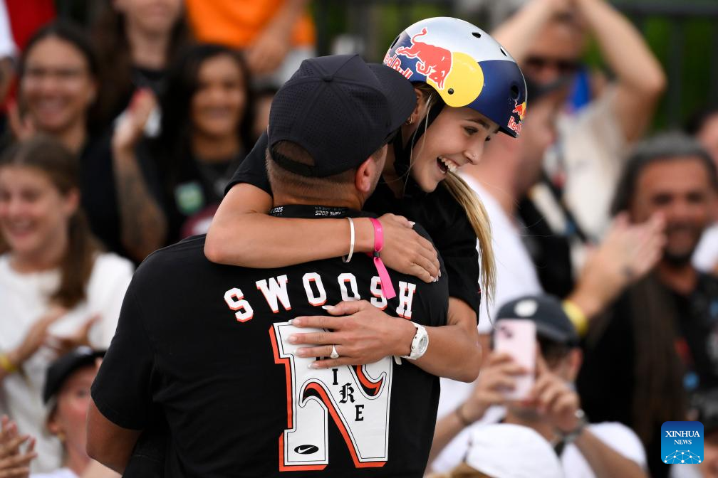 Chloe Covell (back) of Australia celebrates during the women's final match at the street skateboarding World Cup at the Colle Oppio Street Skatepark in Rome, Italy, June 15, 2025. (Photo by Andrea Staccioli/Xinhua)