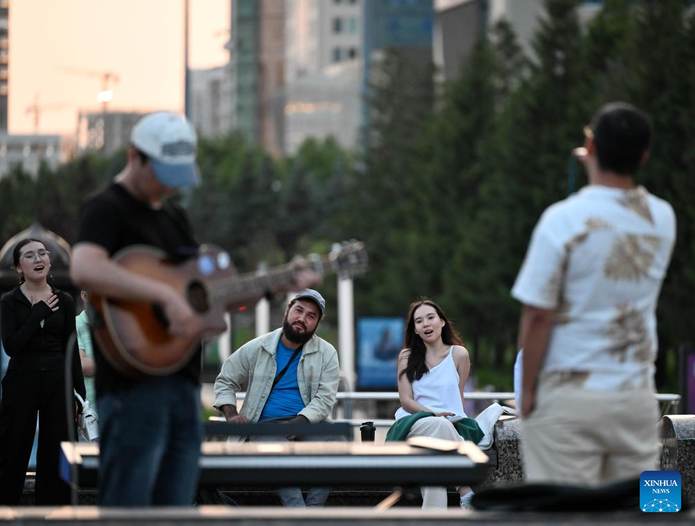 People watch a street performance in Astana, Kazakhstan, June 11, 2025. (Xinhua/Li Renzi)