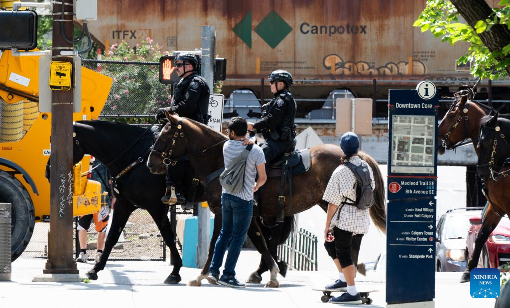 Mounted police patrol on a street in Calgary, Canada, June 15, 2025.