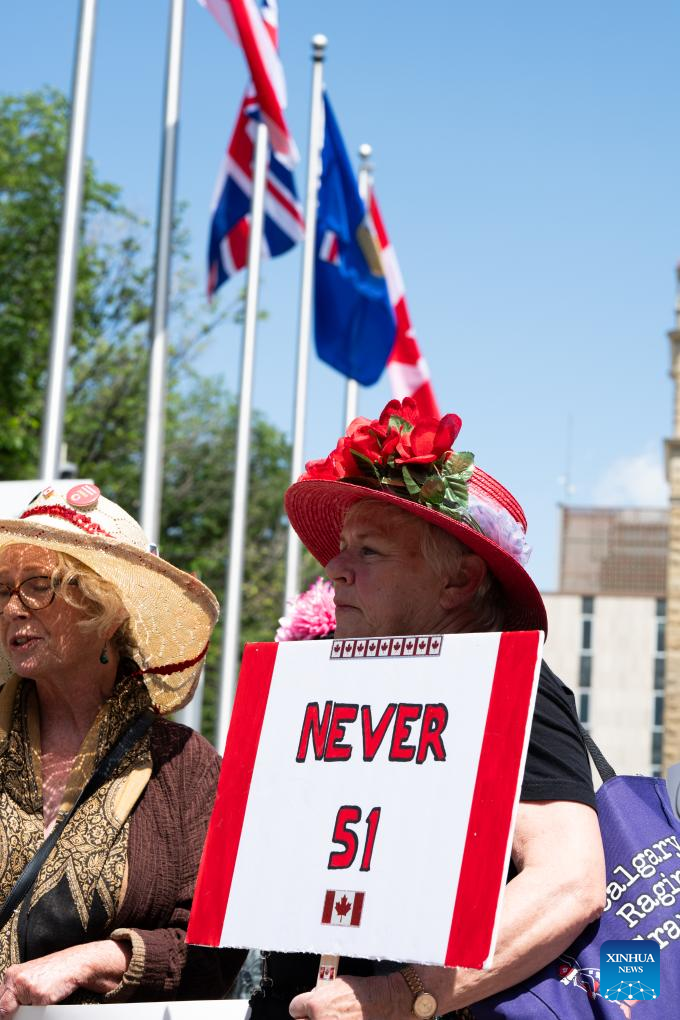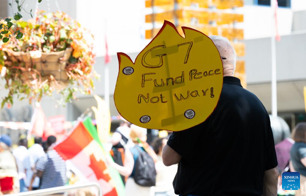 A protester holds a sign during a rally in Calgary, Canada, June 15, 2025. A protest took place in Calgary ahead of the commencement of this year's Group of Seven (G7) summit. Originally scheduled to begin on Sunday, the summit has been shortened to two days and will officially commence on Monday, as world leaders begin arriving in Kananaskis, Alberta, about 100 kilometers away from Calgary. (Photo by Li Haitao/Xinhua)