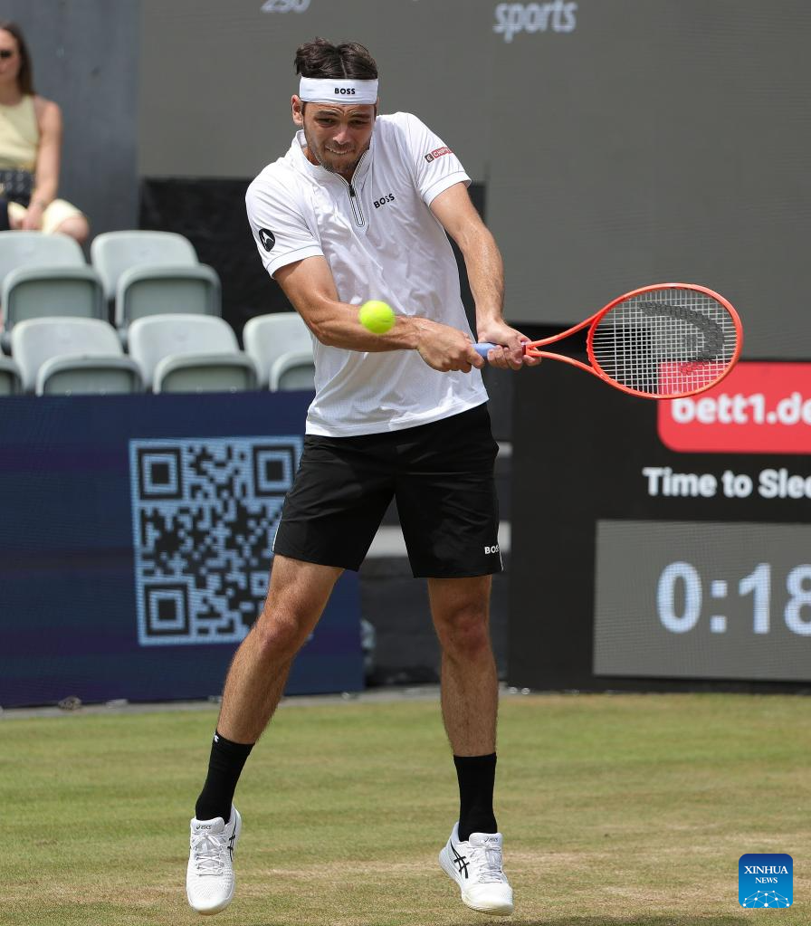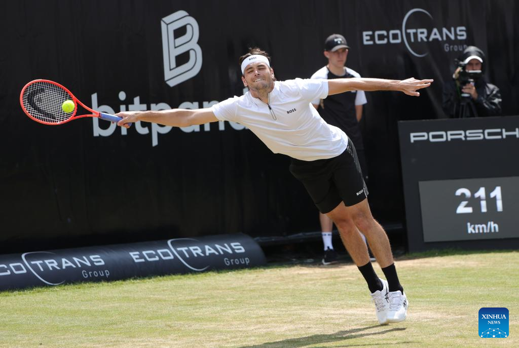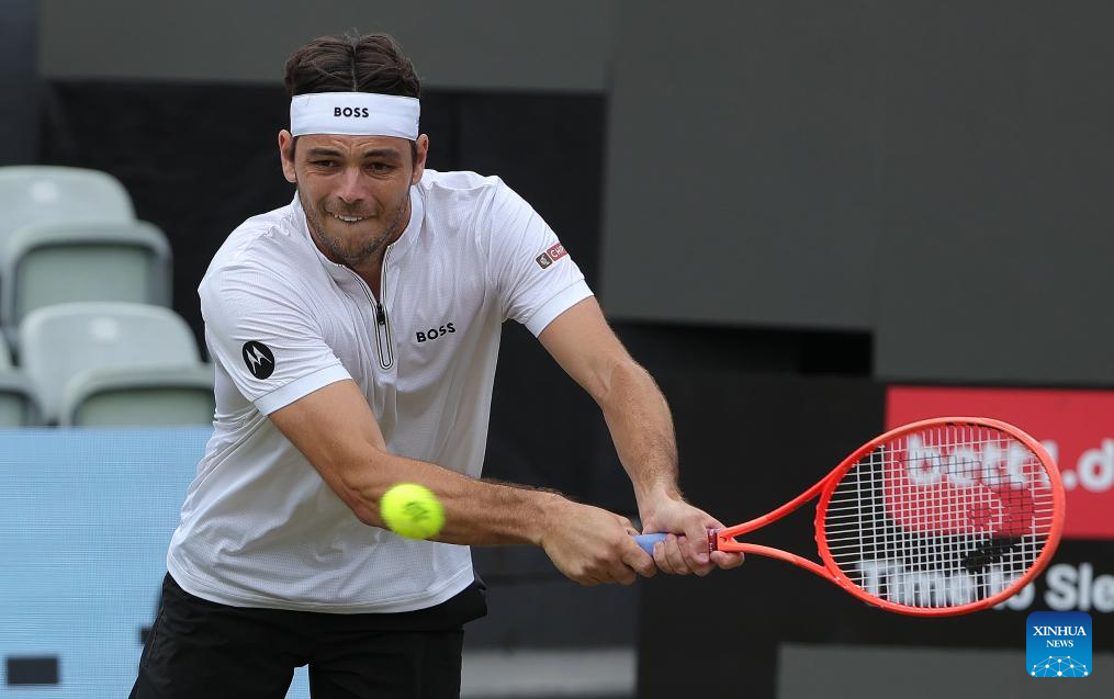 Taylor Fritz of the United States hits a return during the men's singles final between Alexander Zverev of Germany and Taylor Fritz of the United States at the Stuttgart Open 2025 tennis tournament in Stuttgart, Germany, June 15, 2025. (Photo by Philippe Ruiz/Xinhua)