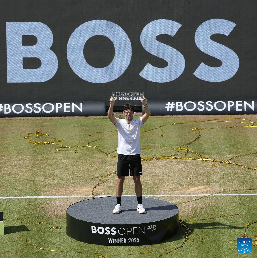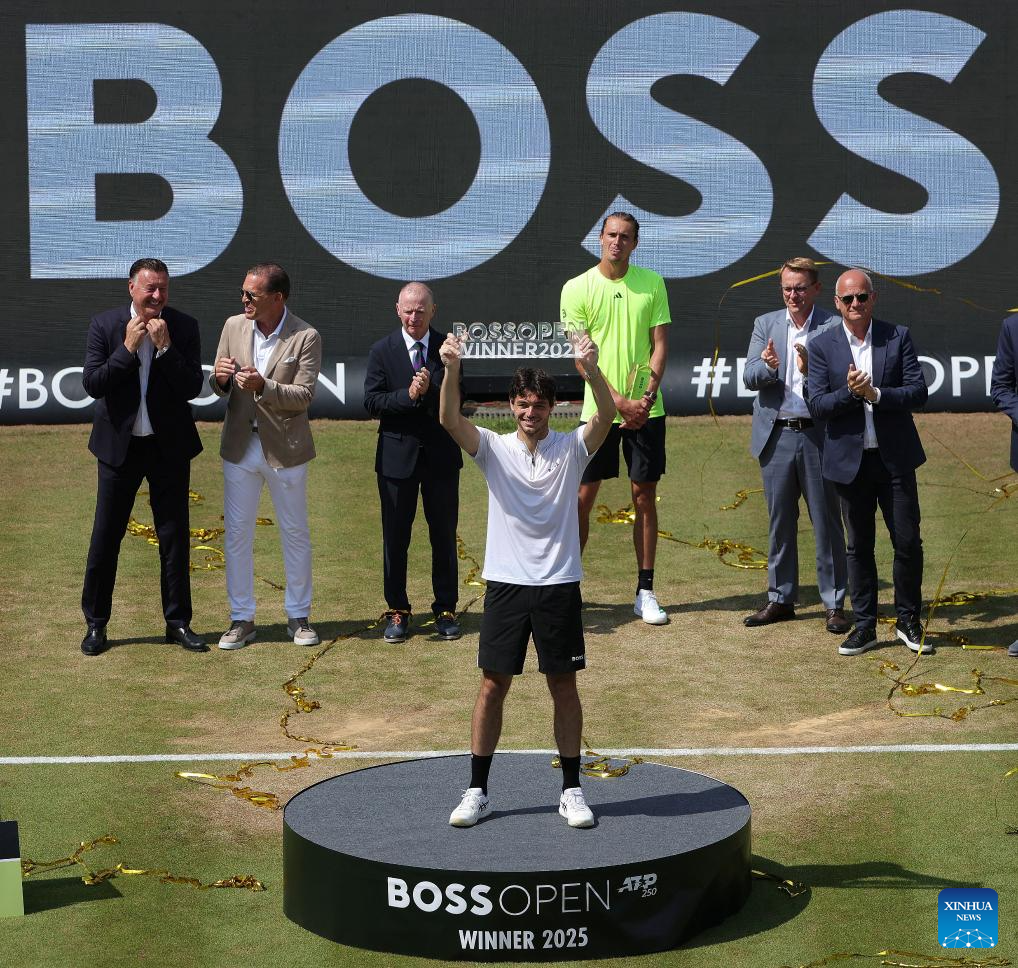 Winner Taylor Fritz of the United States celebrates with the trophy during the awarding ceremony after the men's singles final between Alexander Zverev of Germany and Taylor Fritz of the United States at the Stuttgart Open 2025 tennis tournament in Stuttgart, Germany, June 15, 2025. (Photo by Philippe Ruiz/Xinhua)