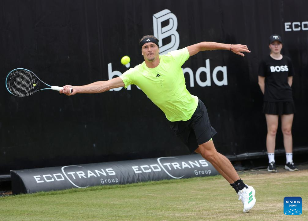 Alexander Zverev of Germany hits a return during the men's singles final between Alexander Zverev of Germany and Taylor Fritz of the United States at the Stuttgart Open 2025 tennis tournament in Stuttgart, Germany, June 15, 2025. (Photo by Philippe Ruiz/Xinhua)