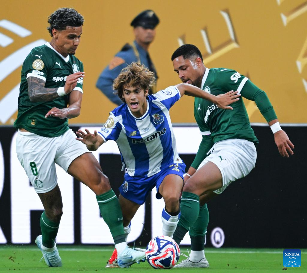 Palmeiras' Richard Rios (L) and Vitor Roque vie with FC Porto's Rodrigo Mora (C) during the Group A match between Palmeiras of Brazil and FC Porto of Portugal at the FIFA Club World Cup 2025 in New Jersey, the United States, June 15, 2025. (Xinhua/Wu Xiaoling)
