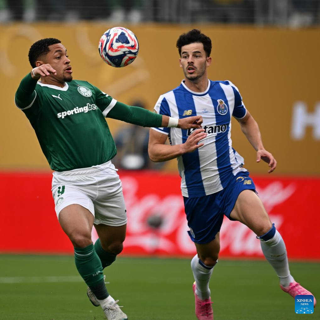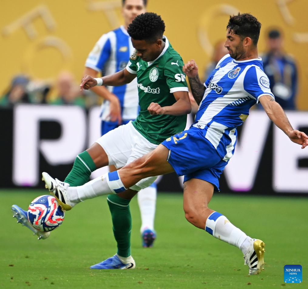 Palmeiras' Vitor Roque (L) vies for the ball during the Group A match between Palmeiras of Brazil and FC Porto of Portugal at the FIFA Club World Cup 2025 in New Jersey, the United States, June 15, 2025. (Xinhua/Wu Xiaoling)