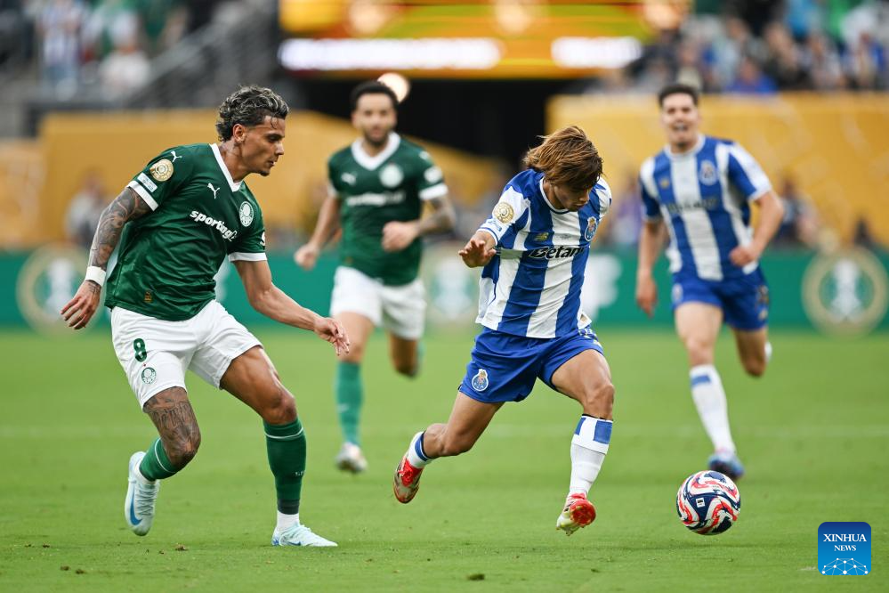 FC Porto's Rodrigo Mora (Front R) breaks through during the Group A match between Palmeiras of Brazil and FC Porto of Portugal at the FIFA Club World Cup 2025 in New Jersey, the United States, June 15, 2025. (Xinhua/Li Rui)