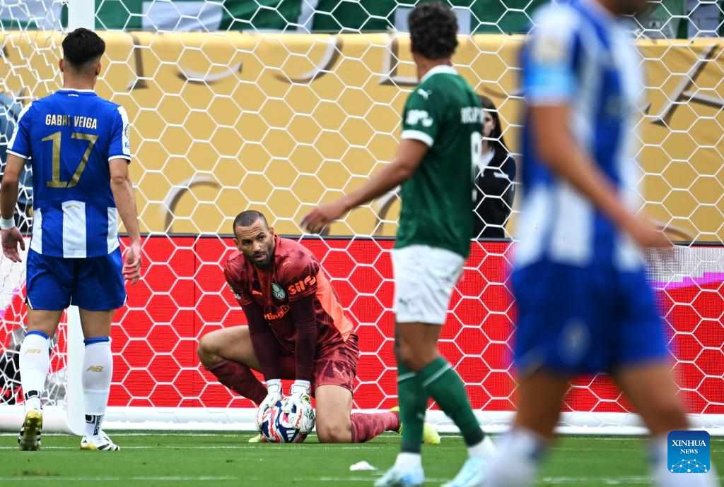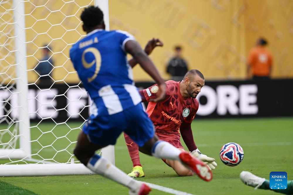 Weverton (2nd L), Palmeiras' goalkeeper, makes a save during the Group A match between Palmeiras of Brazil and FC Porto of Portugal at the FIFA Club World Cup 2025 in New Jersey, the United States, June 15, 2025. (Xinhua/Li Rui)