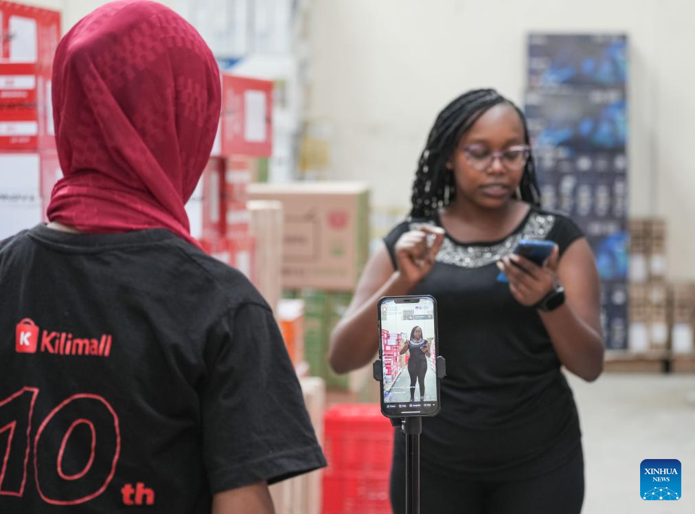 Staff members of Kilimall sell products via live-streaming in Mlolongo, Kenya, on June 3, 2025. (Xinhua/Li Yahui)