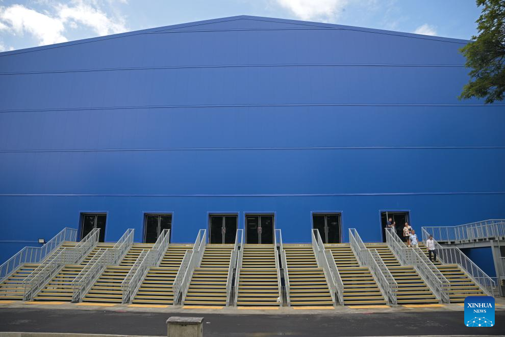 Photo taken on June 16, 2025 shows the facade of the newly-built World Aquatics Championships Arena during a media tour, ahead of the World Aquatics Championships to be held in Singapore Sports Hub. (Photo by Then Chih Wey/Xinhua)