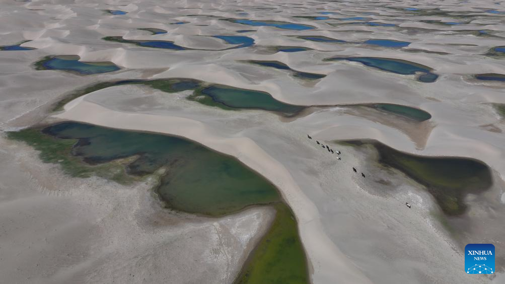 An aerial drone photo shows a herd of horses marching in a desert in Kazak Autonomous County of Aksay, northwest China's Gansu Province, June 14, 2025. (Photo by Gao Hongshan/Xinhua)
