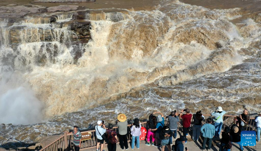 A drone photo shows tourists enjoying the scenery of the Hukou Waterfall on the Yellow River in Jixian County, north China's Shanxi Province, June 15, 2025. (Photo by Lyu Guiming/Xinhua)