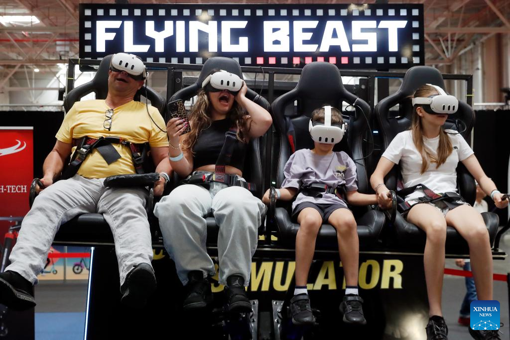 Visitors enjoy a motion simulator during the opening day of Bucharest Tech Expo, part of the Bucharest Tech Week event in Bucharest, Romania, June 14, 2025. (Photo by Cristian Cristel/Xinhua)