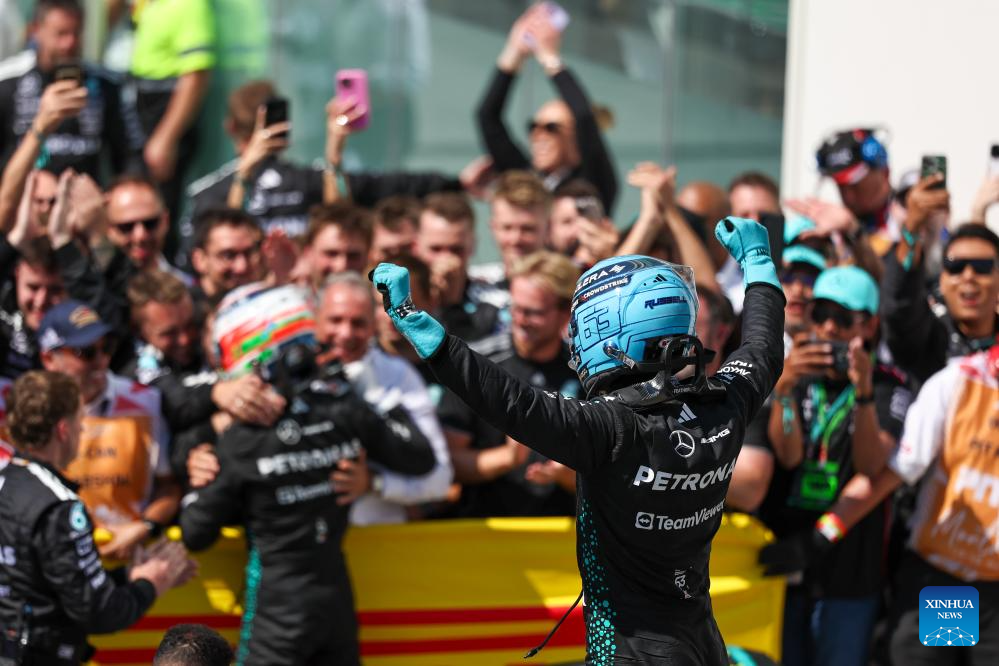 Mercedes' George Russell of Britain celebrates after the race of the Formula One Canadian Grand Prix 2025 at the Circuit Gilles Villeneuve in Montreal, Canada, June 15, 2025. (Photo by Song Haiyuan/Xinhua)
