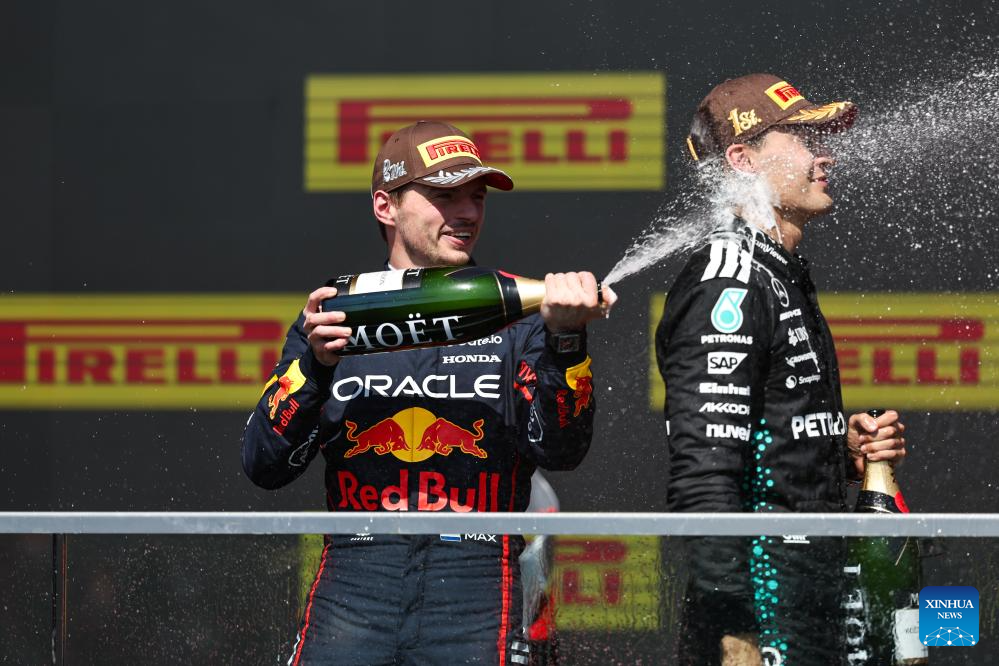 First-placed Mercedes' George Russell (R) of Britain and second-placed Red Bull Racing's Max Verstappen of the Netherlands celebrate during the awarding ceremony after the race of the Formula One Canadian Grand Prix 2025 at the Circuit Gilles Villeneuve in Montreal, Canada, June 15, 2025. (Photo by Song Haiyuan/Xinhua)
