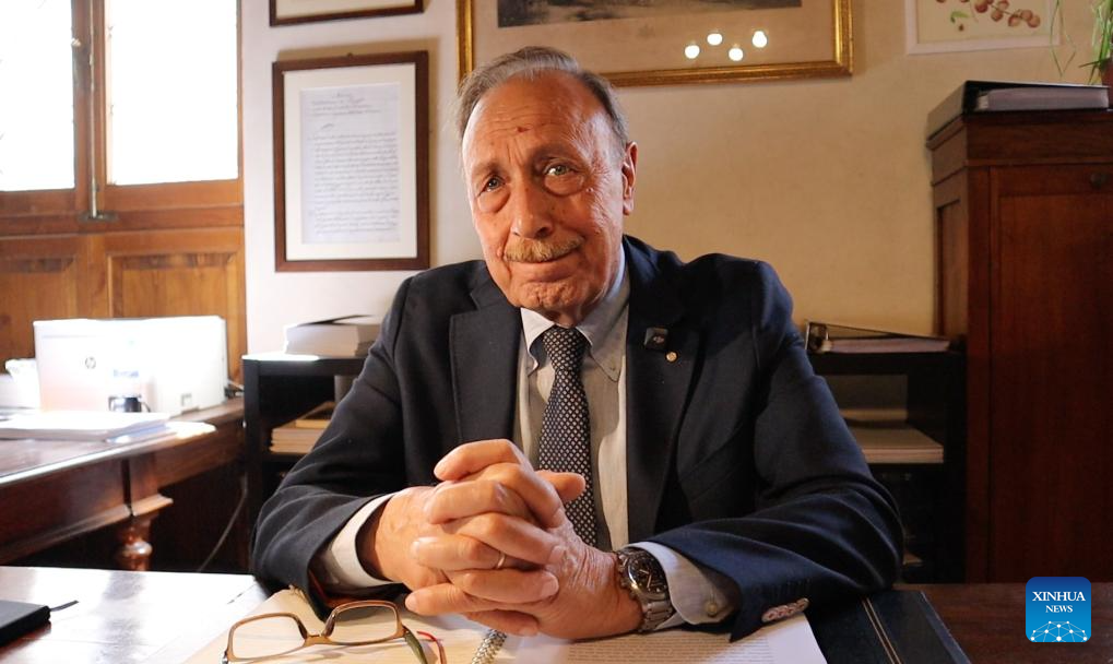 This video clip taken on June 12, 2025 shows Massimo Vincenzini, president of Italy's Georgofili Academy, receiving an interview with Xinhua News Agency at his office in the Georgofili Academy, Florence, Italy. (Photo by Laura Della Corte/Xinhua)