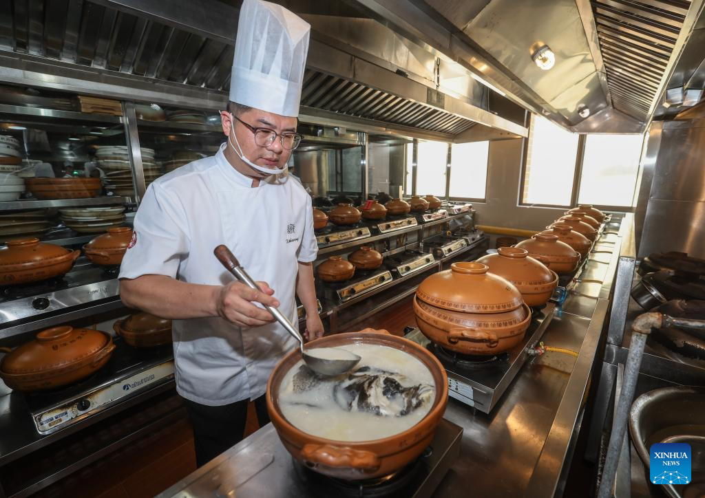 A chef cooks a fish dish at a restaurant in Chun'an County, east China's Zhejiang Province, June 3, 2025. Chun'an, located in east China's Zhejiang Province, is renowned for its water system and outstanding natural environment. As a national-level ecological county, it serves as a model for ecological protection and construction. (Xinhua/Xu Yu)