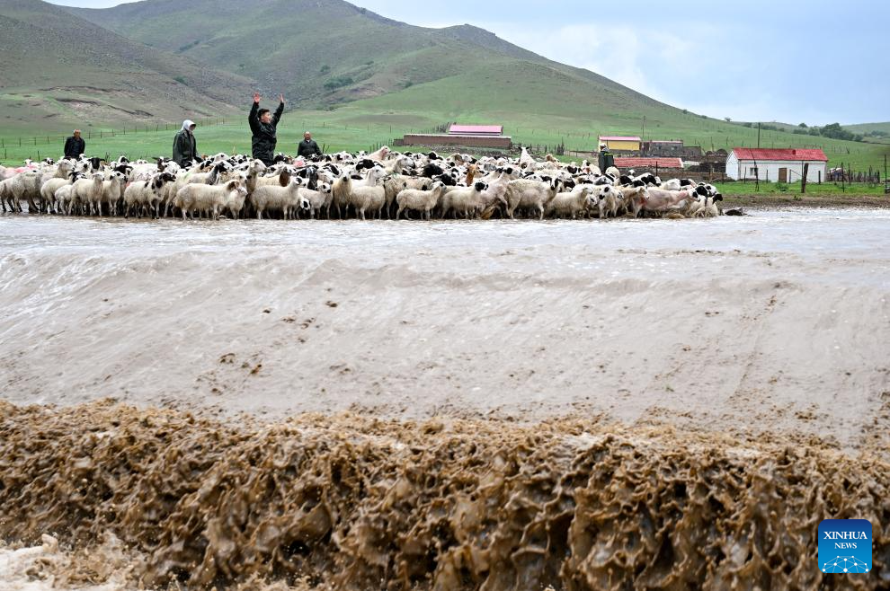 Saintsogt's son wades through the water with two sheep on his way to the summer campsite on Ar Horqin Grassland, Chifeng City of north China's Inner Mongolia Autonomous Region, June 13, 2025.