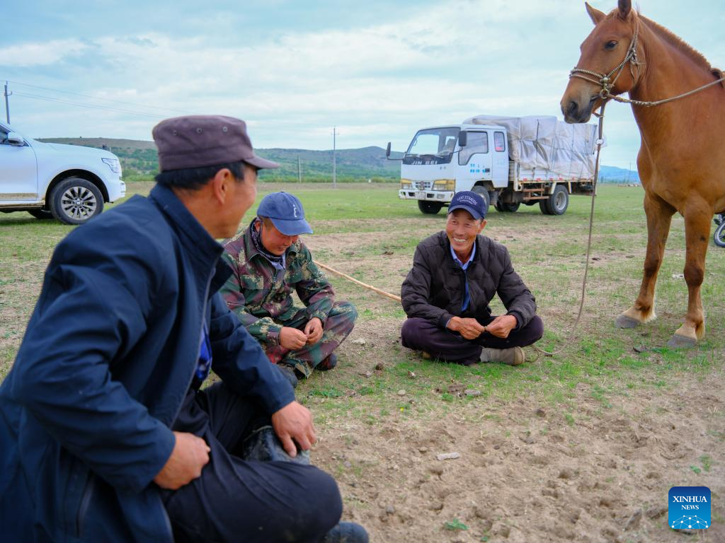 Saintsogt (R) talks with other herdsmen on their way to the summer campsite on Ar Horqin Grassland, Chifeng City of north China's Inner Mongolia Autonomous Region, June 13, 2025.
