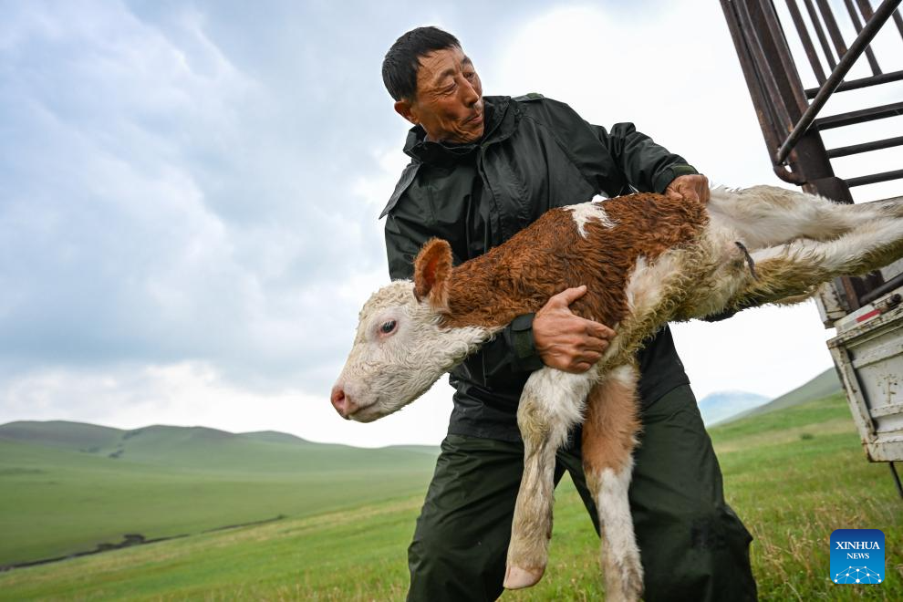 Saintsogt takes a newly born calf off the truck after arriving at the summer campsite on Ar Horqin Grassland, Chifeng City of north China's Inner Mongolia Autonomous Region, June 15, 2025.