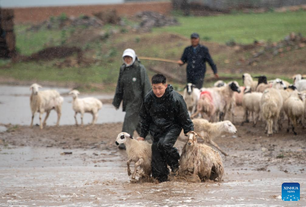 Saintsogt's son (2nd R) drives sheep in rain on his way to the summer campsite on Ar Horqin Grassland, Chifeng City of north China's Inner Mongolia Autonomous Region, June 13, 2025.