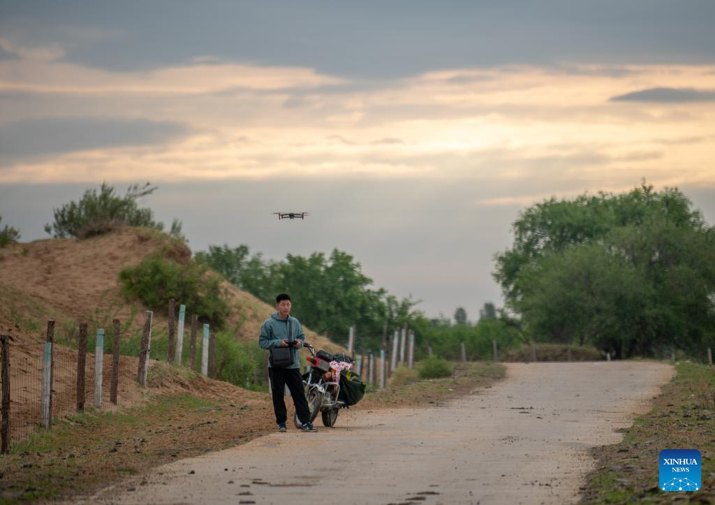 Saintsogt's son operates a drone to check the number of the livestock on Ar Horqin Grassland, Chifeng City of north China's Inner Mongolia Autonomous Region, June 13, 2025.