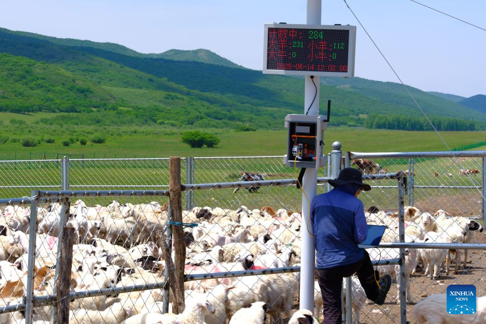 A staff member of Gogodtai Han Ul national nature reserve counts the livestock entering the nature reserve in north China's Inner Mongolia Autonomous Region, June 14, 2025.