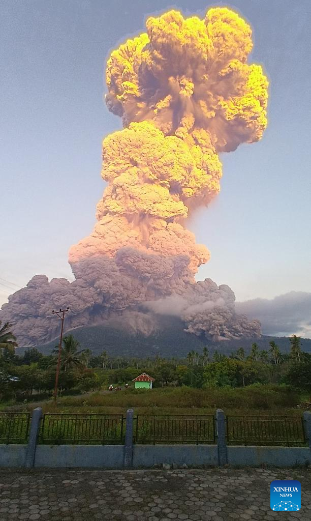 JAKARTA, June 17 (Xinhua) -- Mount Lewotobi Laki-Laki in Indonesia's East Nusa Tenggara Province erupted on Tuesday, spewing a column of ash up to 10 km into the sky and triggering the highest aviation alert, the Volcanology and Geological Disaster Mitigation Center reported.