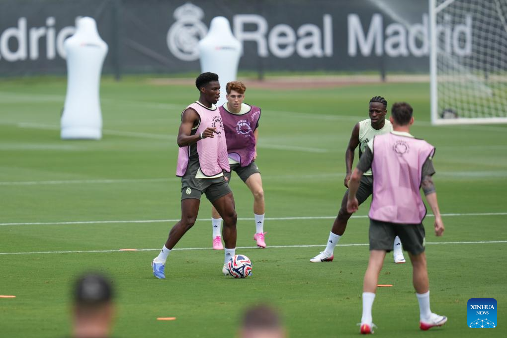 Aurelien Tchouameni (1st L) of Real Madrid attends a training session in Florida on June 17, 2025, ahead of the Club World Cup 2025 football match between Spain's Real Madrid and Saudi Arabia's Al Hilal. (Xinhua/Huang Zongzhi)