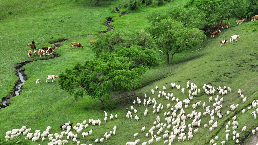 An aerial drone photo taken on June 14, 2025 shows Saintsogt driving the livestock on his way to the summer campsite on Ar Horqin Grassland, Chifeng City of north China's Inner Mongolia Autonomous Region. (Xinhua/Bei He)