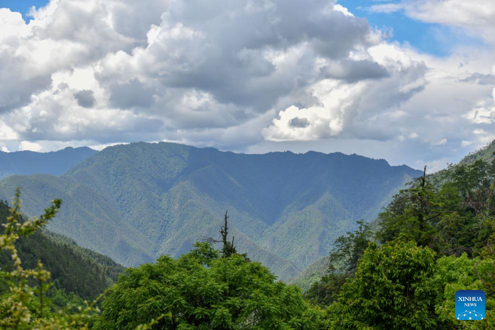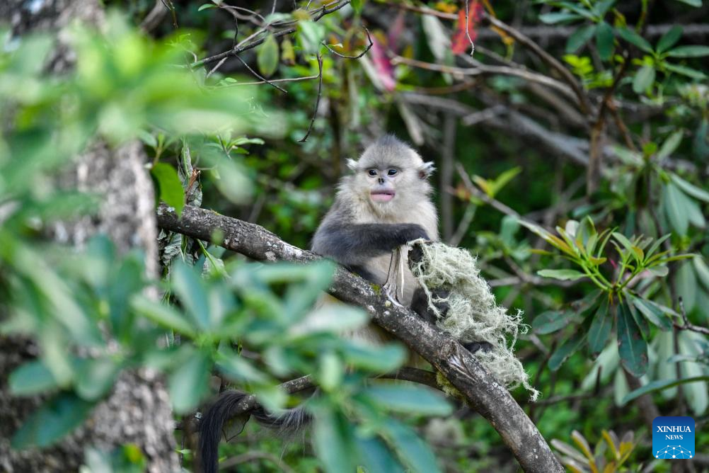 This photo taken on June 15, 2025 shows the Baima Snow Mountain National Nature Reserve in Deqen Tibetan Autonomous Prefecture, southwest China's Yunnan Province. The black-and-white snub-nosed monkey, also known as the Yunnan golden hair monkey, is a national first-class protected animal of China. The species is also on the Red List of the International Union for Conservation of Nature (IUCN).
