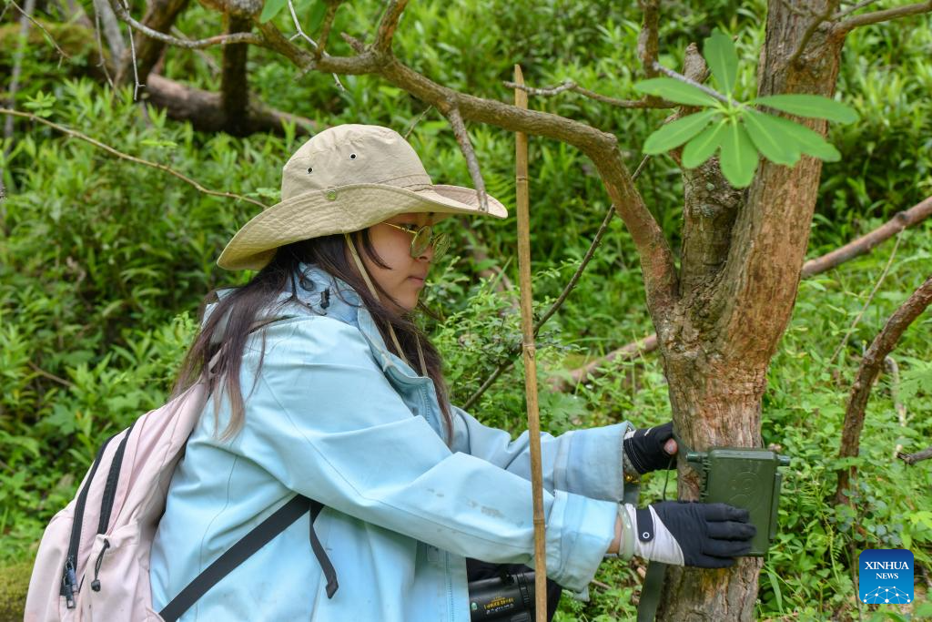 A postgraduate student from the China West Normal University installs a recorder for recording the sound of the black-and-white snub-nosed monkeys at the Baima Snow Mountain National Nature Reserve in Deqen Tibetan Autonomous Prefecture, southwest China's Yunnan Province, June 15, 2025. The black-and-white snub-nosed monkey, also known as the Yunnan golden hair monkey, is a national first-class protected animal of China. The species is also on the Red List of the International Union for Conservation of Nature (IUCN).