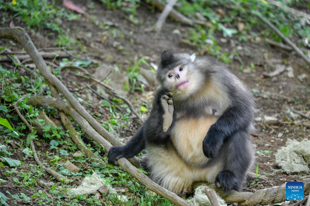 This photo taken on June 15, 2025 shows a black-and-white snub-nosed monkey at the Baima Snow Mountain National Nature Reserve in Deqen Tibetan Autonomous Prefecture, southwest China's Yunnan Province. The black-and-white snub-nosed monkey, also known as the Yunnan golden hair monkey, is a national first-class protected animal of China. The species is also on the Red List of the International Union for Conservation of Nature (IUCN).