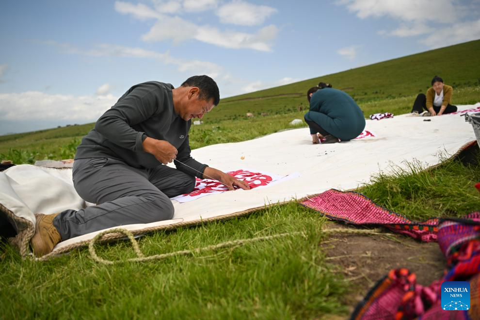 Balatijan Eremubai (L), his wife (R) and his brother's wife make decorations on a yurt on the summer pasture in Xinyuan County, northwest China's Xinjiang Uygur Autonomous Region, June 11, 2025, the second day of summer transfer. Xinjiang, home to lush pastures, is one of China's key livestock production base. The Ili River Valley on the northern slopes of the Tianshan Mountains boasts abundant grassland resources. Every June, local herders took their livestock to summer pastures at higher altitudes where grass is abundant.