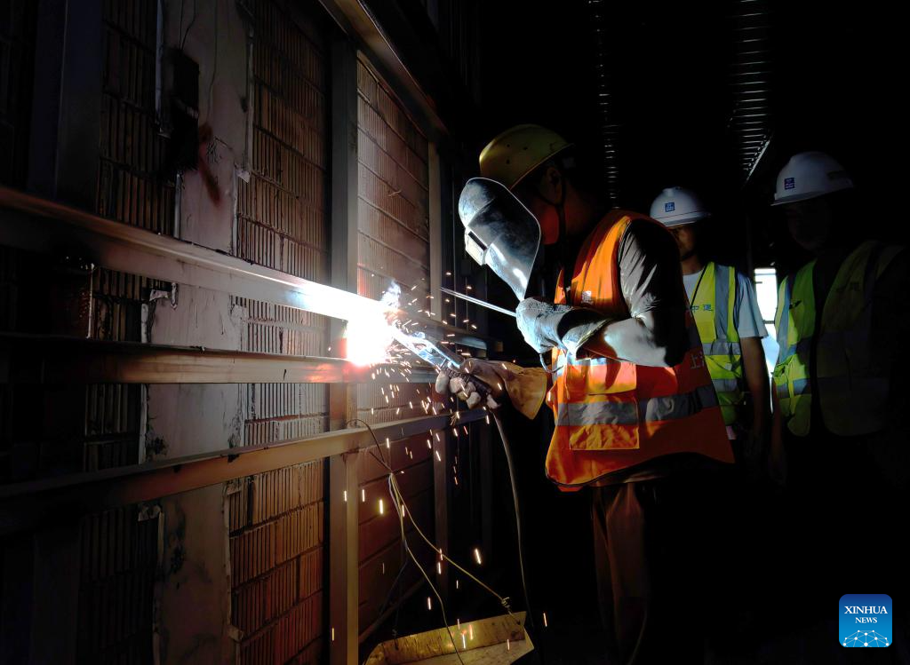 A worker conducts welding operation at the construction site of Xiang'an International Airport in Xiamen, southeast China's Fujian Province, June 16, 2025. The construction of the airport is expected to be completed by the end of this year. It will be put into operation by the end of 2026. By then, the airport will be able to meet the annual passenger throughput of 45 million people, cargo and mail throughput of 750,000 tonnes, and aircraft take-offs and landings of 380,000. (Xinhua/Wei Peiquan)