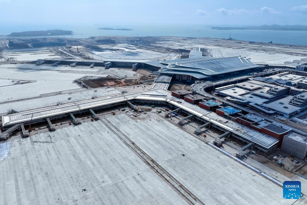 An aerial drone photo taken on June 9, 2025 shows the construction site of Xiang'an International Airport in Xiamen, southeast China's Fujian Province. The construction of the airport is expected to be completed by the end of this year. It will be put into operation by the end of 2026. By then, the airport will be able to meet the annual passenger throughput of 45 million people, cargo and mail throughput of 750,000 tonnes, and aircraft take-offs and landings of 380,000. (Xinhua/Wei Peiquan)